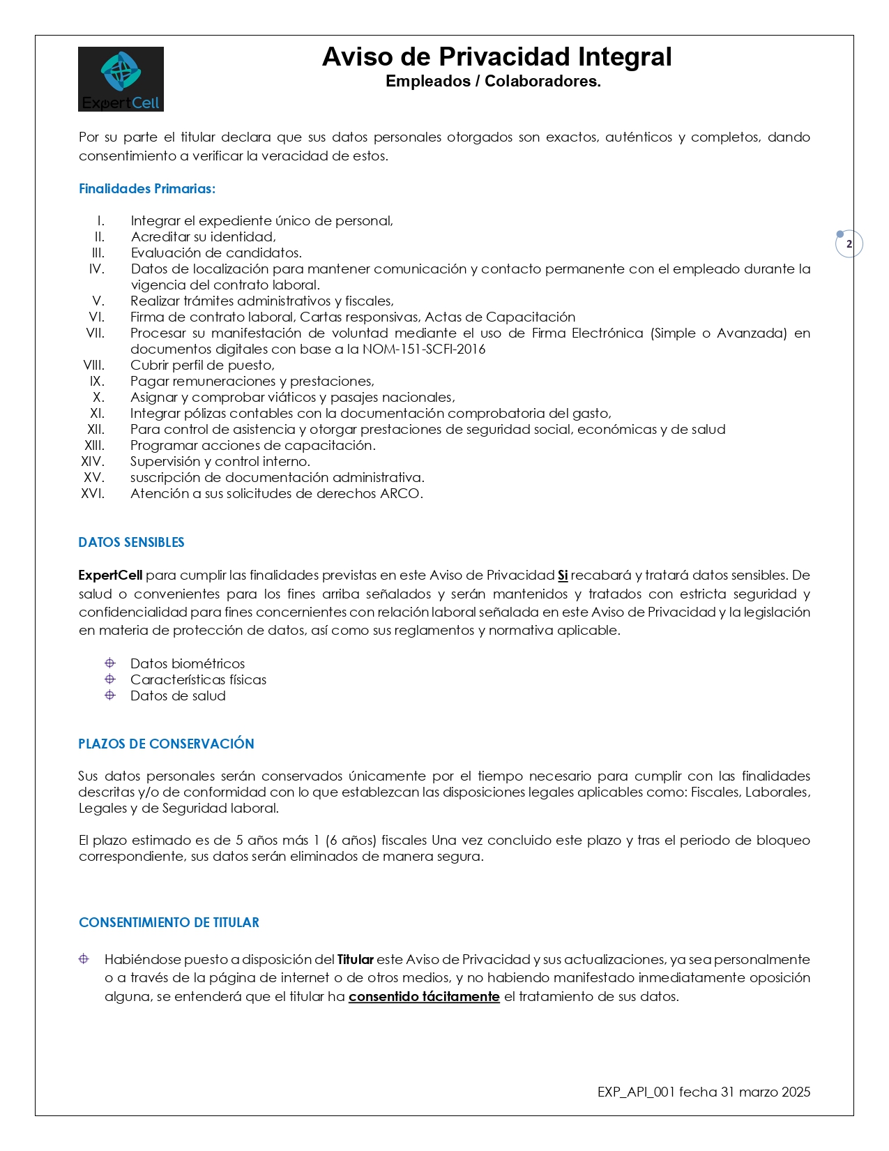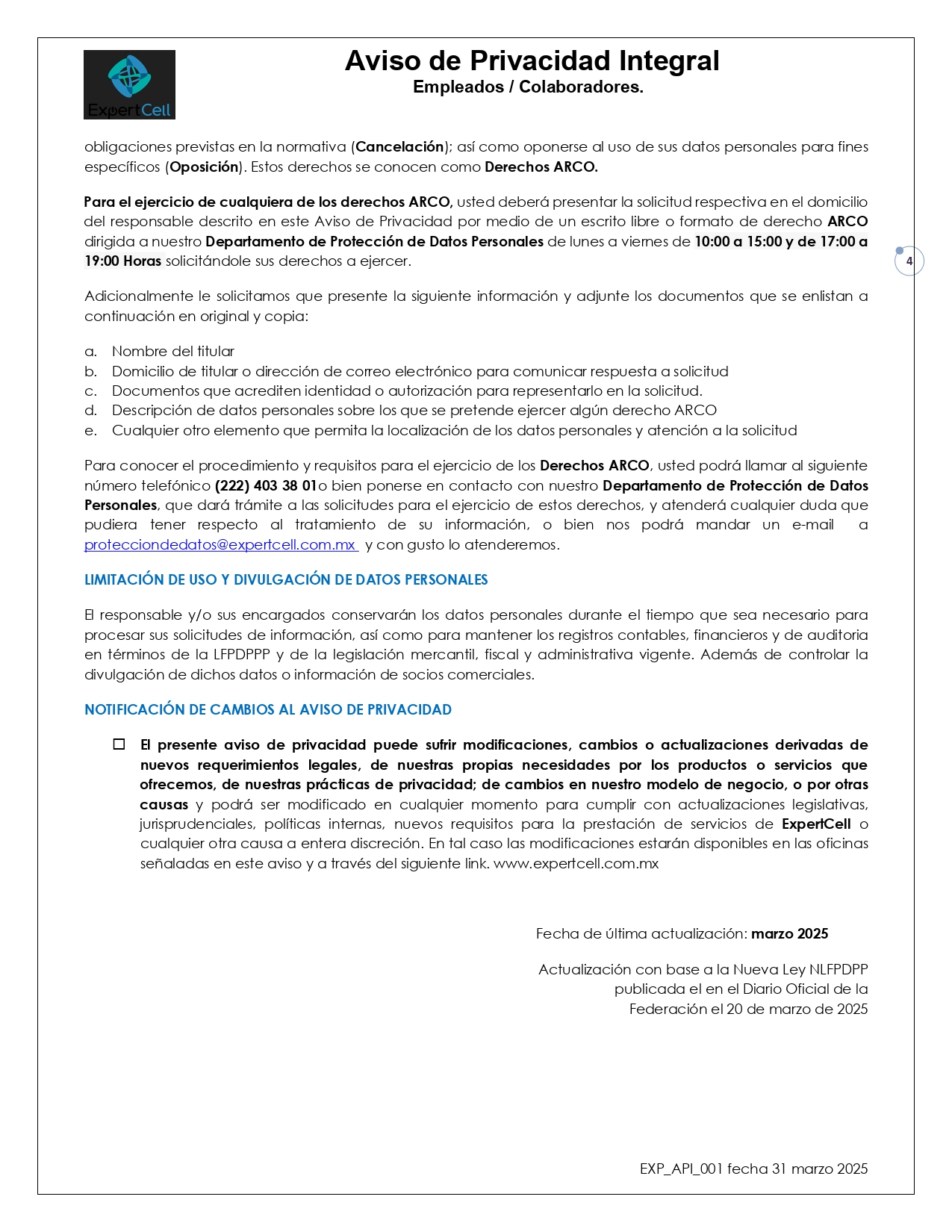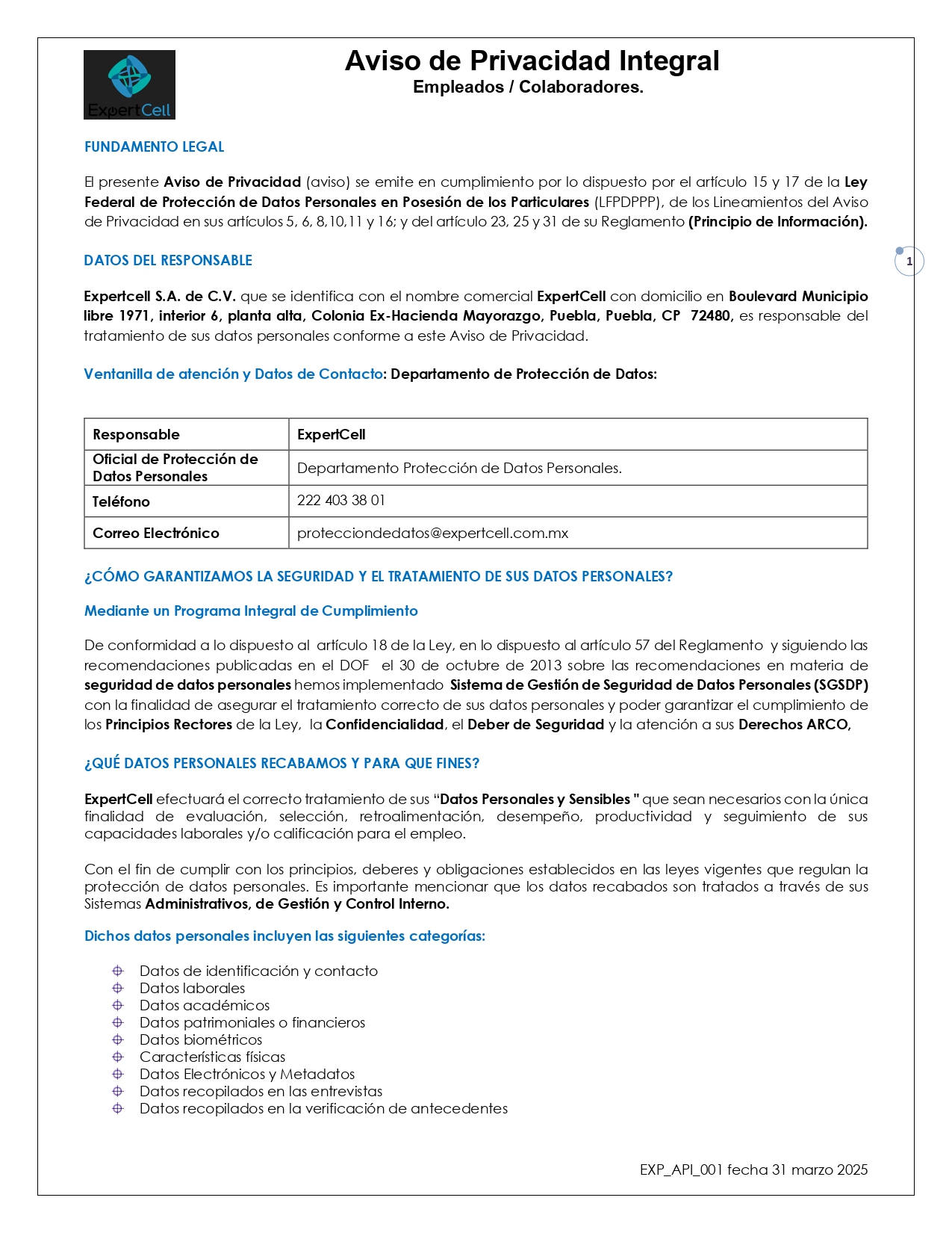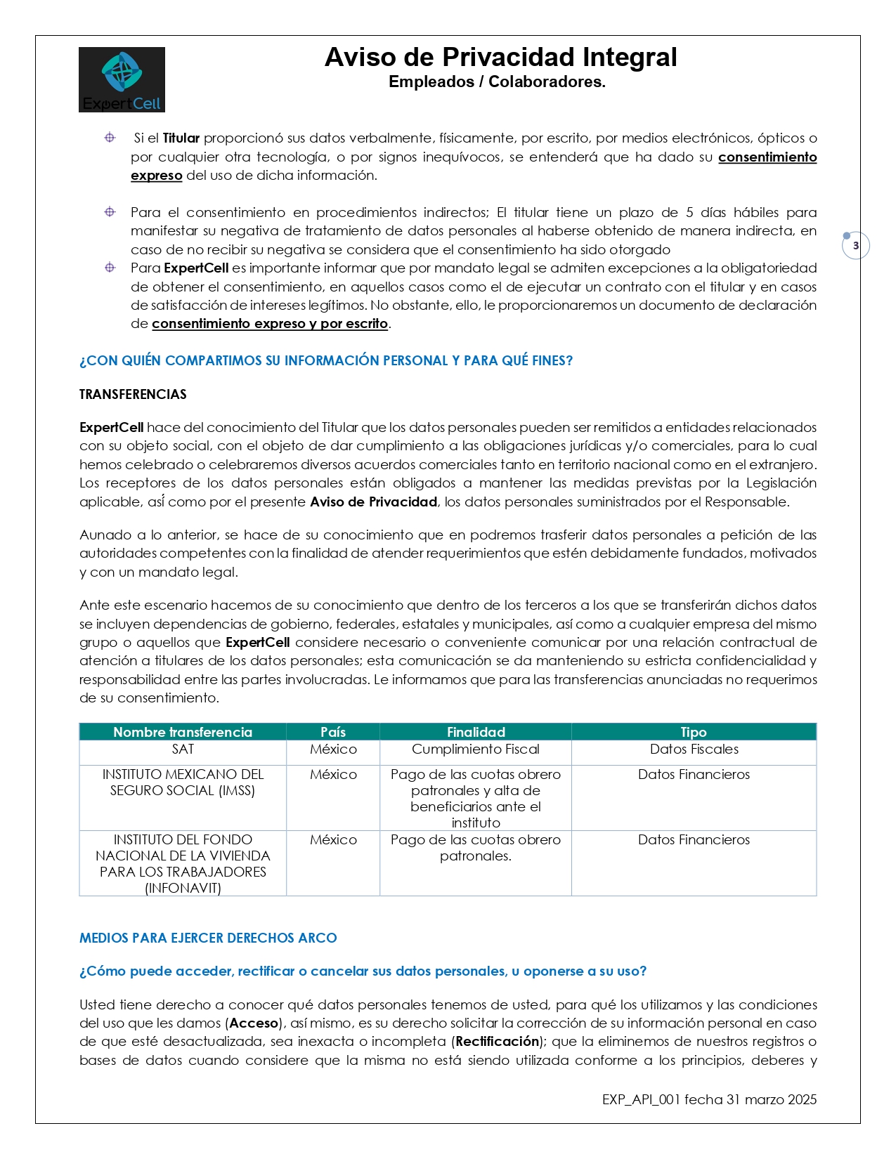 Aviso de Privacidad Integral EMPLEADOS Y COLABORADORES.